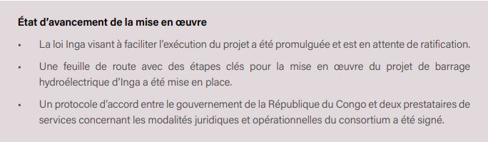 Le rapport fait état d’un projet majeur d’installation de production d’électricité actuellement en cours de réalisation : le barrage du Grand Inga, projet hydroélectrique sur le fleuve Congo en République démocratique du Congo. La construction de ce barrage devrait permettre de produire 43.200 MW d’électricité.